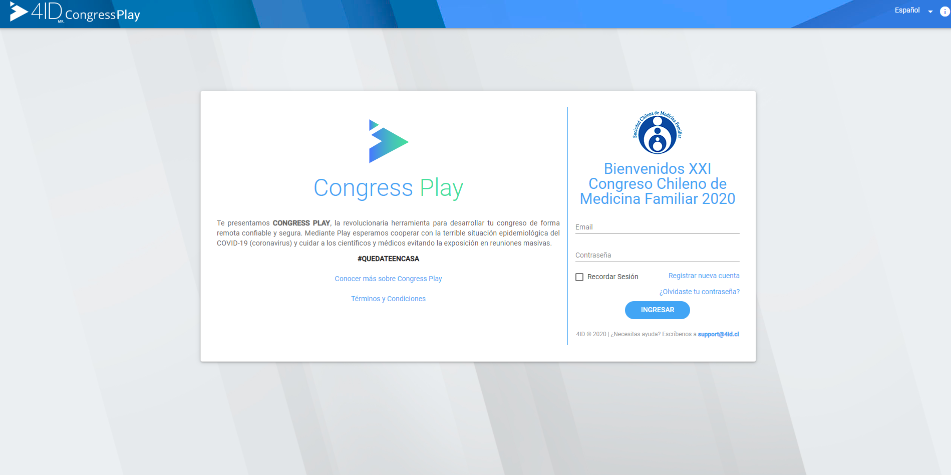 1.- Iniciar sesión en https://play.4id.science/medfam4/login con su cuenta 4ID (Debe estar previamente inscrito en nuestro Congreso)